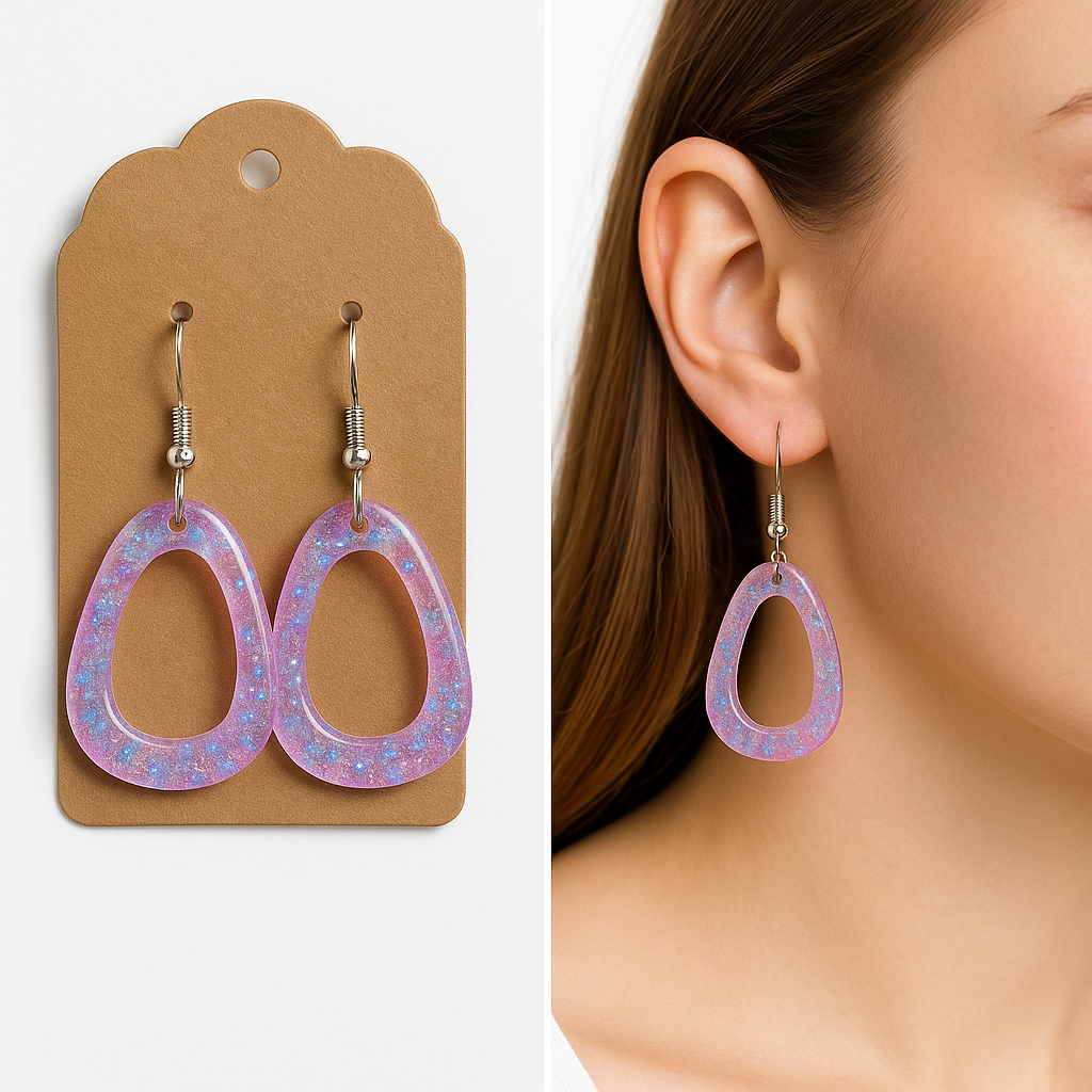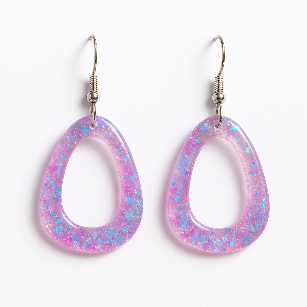 Transparante lila-roze ovale oorhangers met fonkelende flakes die doen denken aan het noorderlicht. Het organische, open design vangt het licht bij elke beweging en geeft een zachte, dromerige gloed – perfect voor wie een vleugje magie aan haar dagelijkse look wil toevoegen. Denk aan avondzon op water en kleurrijke sterrenstof, maar dan aan je oren.