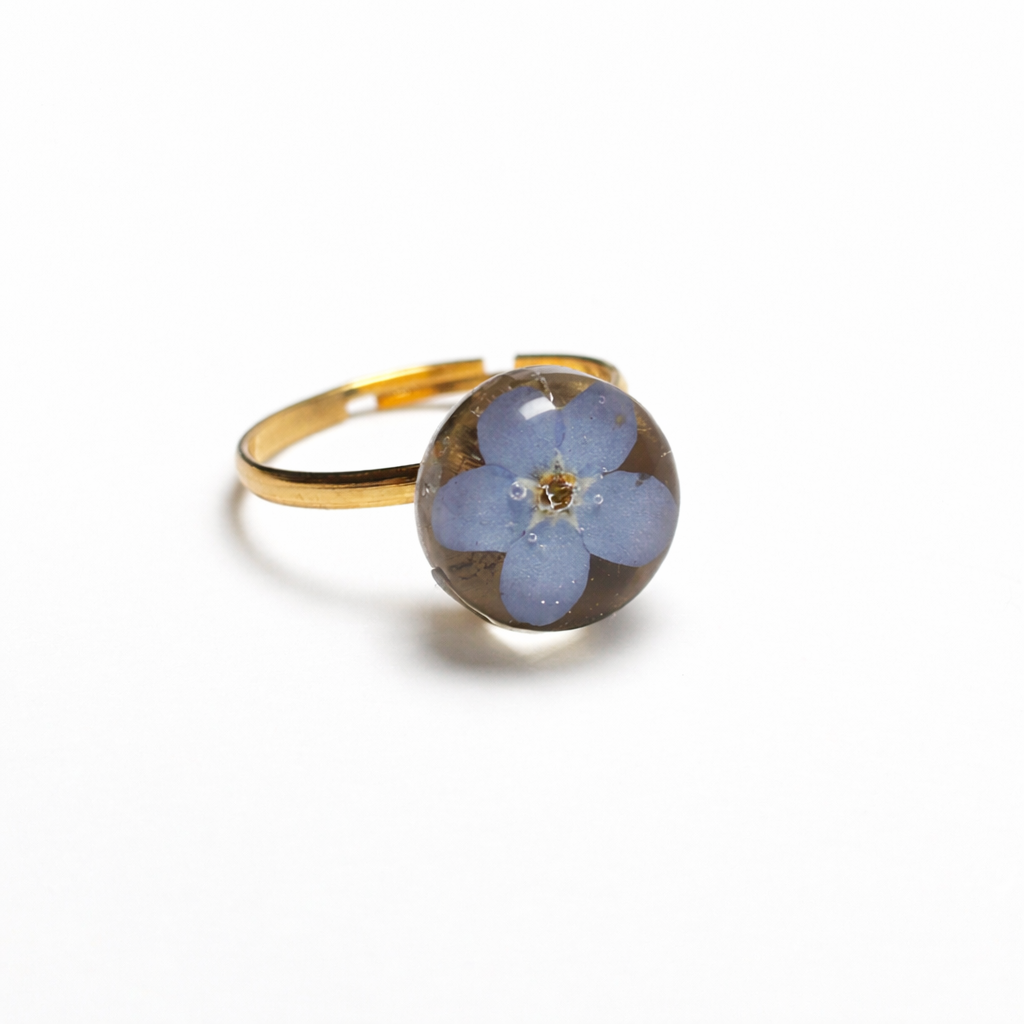 Een elegante, handgemaakte ring die een echt biologisch vergeet-mij-nietje vangt in helder resin — een subtiel symbool van liefde, herinnering en verbinding. De ring is 12 mm en is verstelbaar.