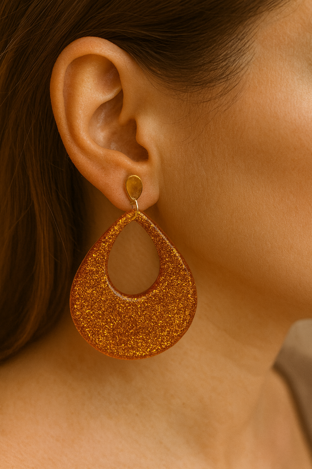 Voeg instant sparkle toe aan je look met deze handgemaakte Golden Glow Drops. Lichtgewicht, gevuld met warm gouden glitter en afgewerkt met hypoallergene RVS hangers die niet verkleuren. Stijlvol, sprankelend en perfect voor elke gelegenheid.