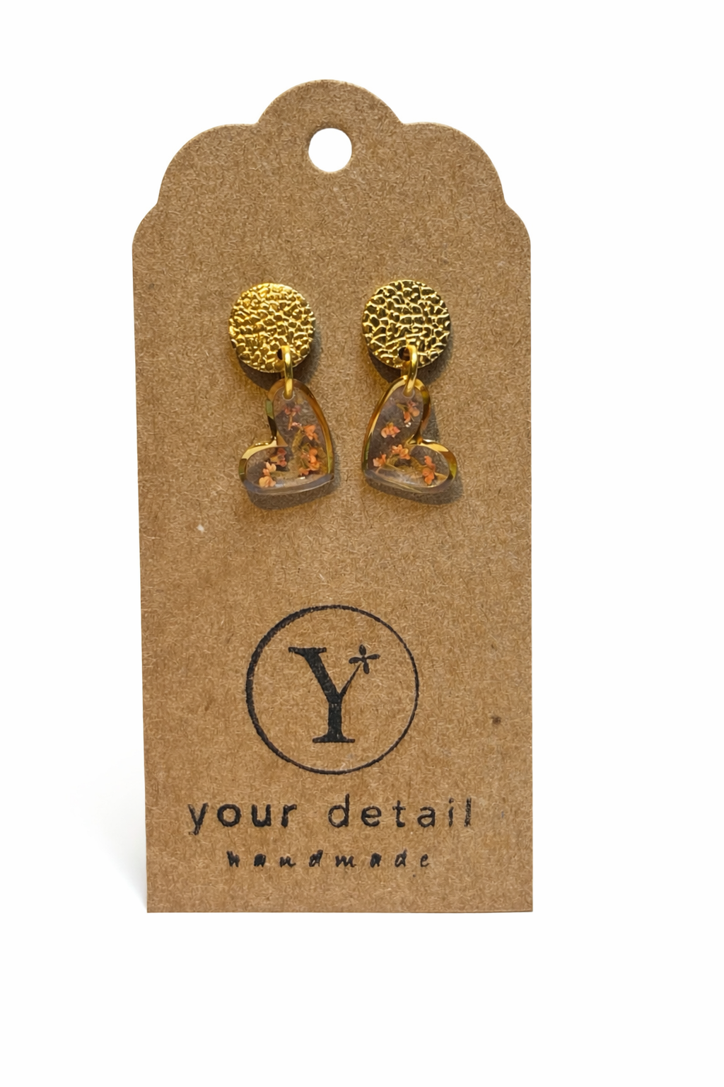 Soms zegt een klein detail alles. Golden Heart is een paar handgemaakte oorbellen waarin liefde en vakmanschap samenkomen. In het transparante hart zijn echte gedroogde bloemetjes zorgvuldig verwerkt, waardoor elk paar uniek is. Geen twee harten zijn precies hetzelfde – net als de persoon die ze draagt.