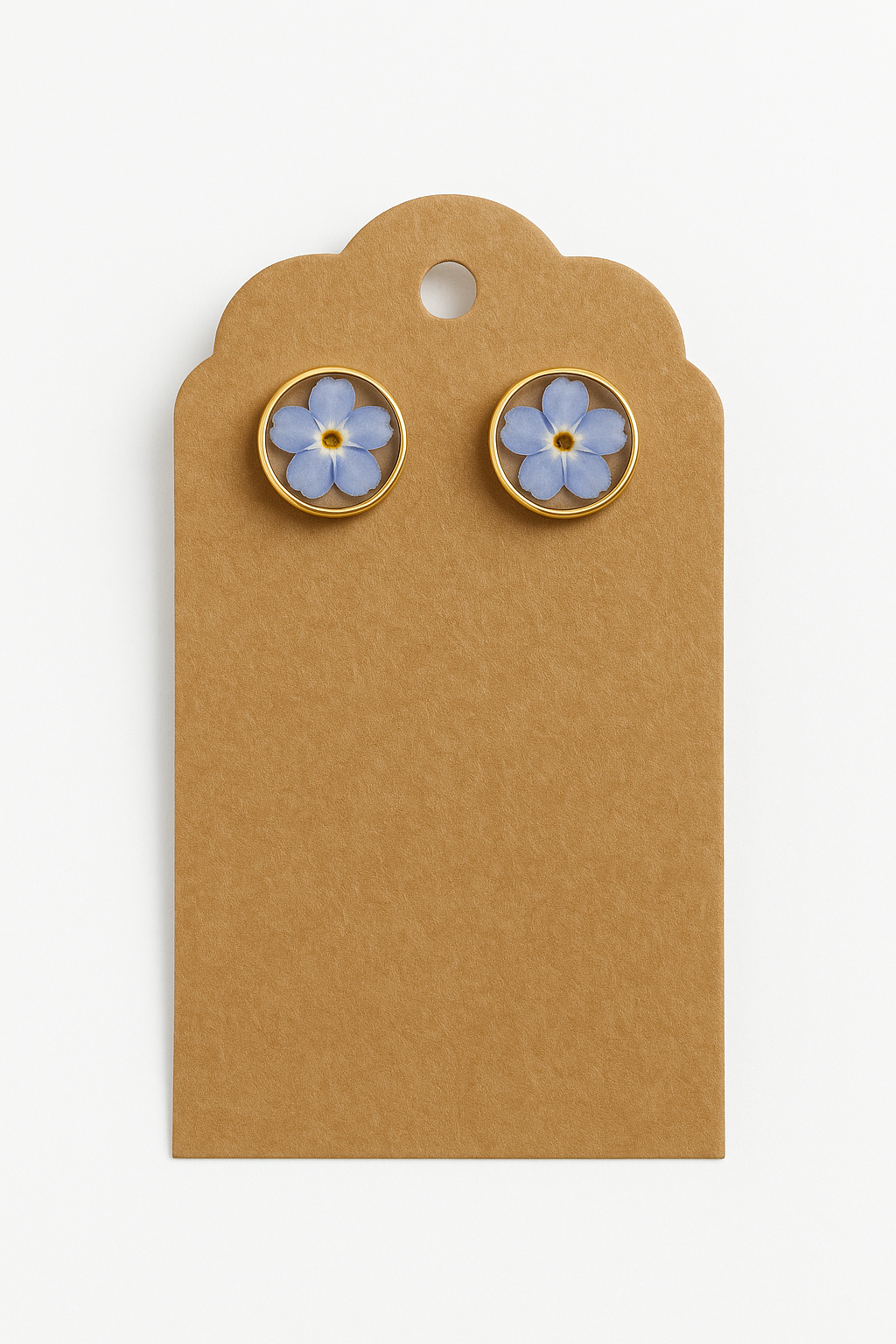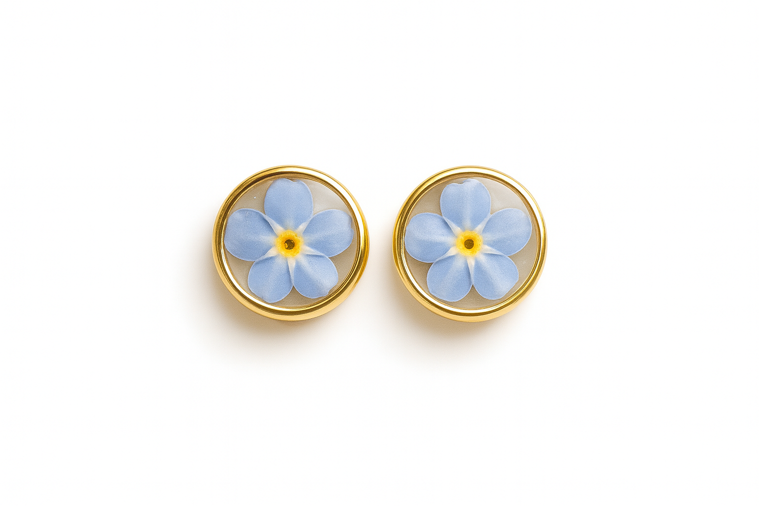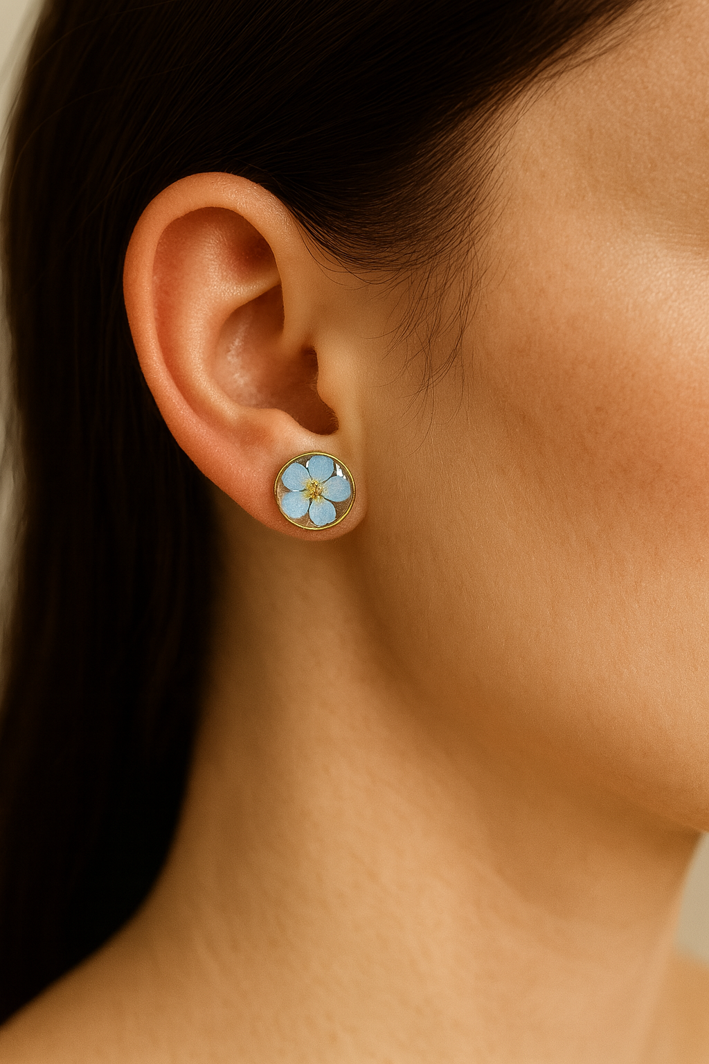 Deze zachte pastelblauwe oorstekers met biologische vergeet mij nietje er in met subtiele gouden omlijsting doen denken aan een helder morgenlicht dat door bloemblaadjes valt. Het stervormige detail in het hart geeft een dromerige, bijna etherische uitstraling—alsof je een vleugje hemel draagt. Elegant, klein en tijdloos; perfect voor een serene, natuurlijke look met een sprankje magie.